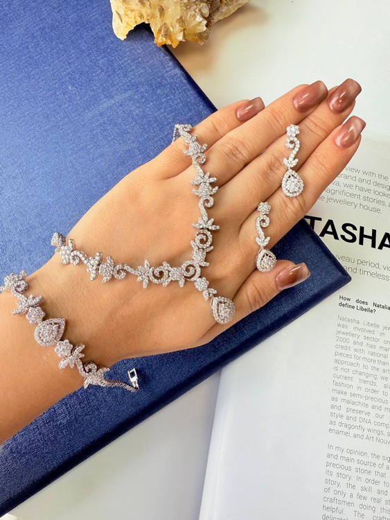 نقره عیار ۹۲۵ با آبکاری رودیوم، نهتنها تضمینکننده دوام و ثبات رنگ است، بلکه حس لمس یک جواهر واقعی را منتقل میکند. نگینهای زیرکنیای برش جواهری با درخشش چشمگیر خود، کیفیت بصری این سرویسها را کامل میکنند.